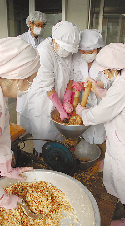 前日に水で漬け込んだ大豆をゆであげ、塩と麹で混ぜ込むと、専用の機械で細かく潰してミンチにした。その後、団子状にまるめ、10キロと5キロの樽に仕分け。一日がかりで約440キロを仕込んだ。今後、各小学校で保管され、発酵し味噌となった秋以降に学校給食で活用される予定。新宿小(緑区)の栄養士戸田千鶴さんは「この味噌づくりは中央小に務めていた時、授業で取り組んだのがきっかけ。その後、栄養士有志で続け、昨年から正式行事に」。初参加の栄養士は「豆類が嫌いな子も多いが、地元産なら、美味しく食べてくれるはず」と話した。