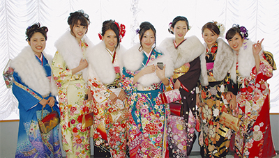式典当日、会場は振袖や袴に身を包んだ新成人で溢れ、久しぶりの再会に喜ぶ笑顔が見られた。