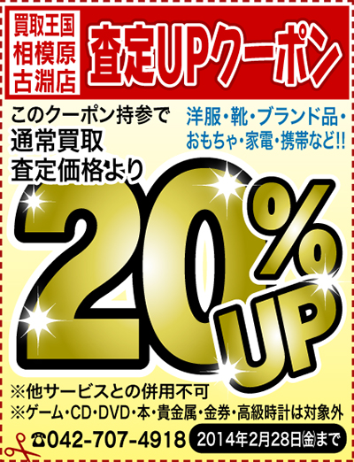「物を売ることは難しいことではありません。身分証明書があればOK。あとは査定をお待ちいただくだけです」と同店。今なら左のクーポンで査定額が通常よりも20%UP。さらに買取成立で2月2日(日)まで、同店での3千円以上の買い物時に使える500円分の「エコチケット」をプレゼント(3月末まで使用可)。そして、貯まったポイントで買い物できるお得な会員カードが入会無料と、特典も盛りだくさんだ。