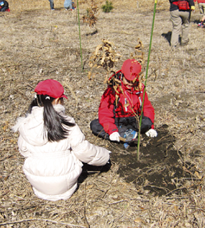 市立双葉小学校(南区双葉、内田幸博校長、483人)の児童が1月27日、近隣にある木もれびの森(相模原中央緑地)でクヌギ、コナラの植樹を行った。