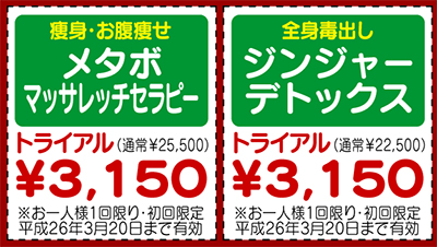 腹筋数百回分の運動効果があるという「ボディセラプロ」マシンが約25分。さらに今話題の「腸ケア」腸管マッサージも嬉しい限り。 そしてジンジャーパックと全身両面キレックスマッサージが炸裂する「ジンジャーデトックス」は解毒感がたまらない「逸品」。春までに代謝アップ、脂肪撃退したい人、今すぐサロンへ。