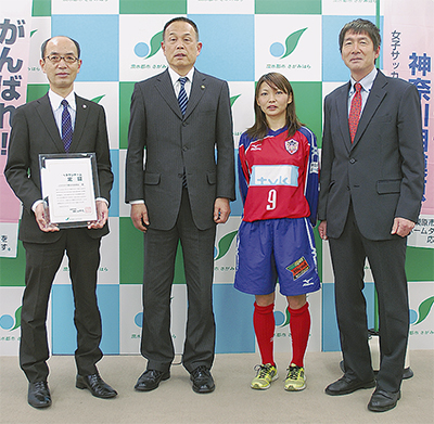 相模原市役所で3月7日、認定証の交付式が行われ、加山俊夫相模原市長は「市の代表として活躍に期待」と激励。山内代表は「地域に必要とされる存在に」と応えた。また、同席した監督兼ゼネラルマネージャーの菅野将晃(かんのまさあき)さんは「なでしこ入りをして、優勝できるように。常に上をめざしていきたい。女子サッカーの普及・育成にも力を入れたい」と抱負を語り、主将の尾山沙希(さき)さんは「チームをもっと知ってもらい、応援してもらえるように努力したい」と話した。