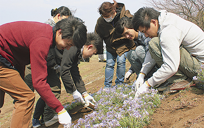 関東に春一番が吹いた3月18日。河川敷に麻布大学環境科学科(中央区淵野辺)の学生7人が集まった。彼らは同大学の有志で結成された地域活動団体「Mof」(モフ/Mission〜of〜flower)のメンバー。現在、総勢14人で活動している。この日メンバーは、4月6日(日)から20日(日)まで同地で開催される「相模川芝ざくらまつり」に向け、斜面一区画23m×約5mに、保存会や市みどりの協会から提供された約2千株の芝ざくらを植栽。「モンブラン」「オーキントンブルー」など5種類ほどを、鯨や貝がら、桜の花びらの模様にかたどった。