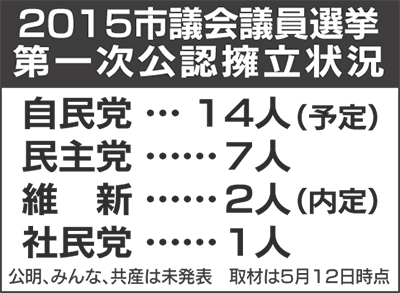 社民党は現状、現職の金子豊貴男市議の公認だけが決まっている。「今後は公募を含めた候補者の擁立を検討する」と話している。