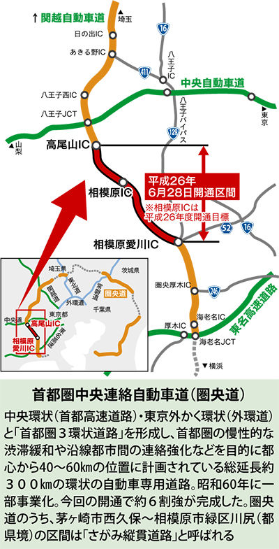 首都圏中央連絡自動車道(圏央道)の相模原愛川インターチェンジ(IC/厚木市上依知(かみえち))から高尾山IC(八王子市南浅川町(みなみあさかわまち))までの区間が6月28日に開通した。これにより、東名高速道路(東名)、中央自動車道(中央道)、関越自動車道(関越道)の「3大動脈」が都心を経由せずに連結。都内や周辺地域の幹線道路の渋滞緩和や、観光振興などが期待される。