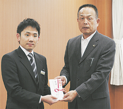 同ホールは6月1日に、「人形供養」を実施し、そこで供養料として預かった金額の一部を「市の福祉に役立ててほしい」と、今回市に寄付することに。市役所を訪れた同ホールの大槻誠マネージャーが加山俊夫市長に15万円を手渡した。加山市長は「皆さんのお気持ちが有難い。大事に使わせていただきます」と話していた。