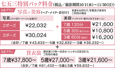 パックの種類は、「貸衣裳(小物一式含む)+着付け・ヘアメイク+写真」の3点プランと、着物は持参で「着付け・ヘアメイク+写真」を利用する2点プランの2通り。基本料金(税込)は、3点プランは7歳が8万1432円、5歳と3歳が5万9832円から。2点プランは7歳が4万3632円、5歳が3万2832円、3歳が3万8232円から。貸衣裳の種類(3点プランのみ)や写真台紙、ポーズ数などで料金が変わる=下表参照。