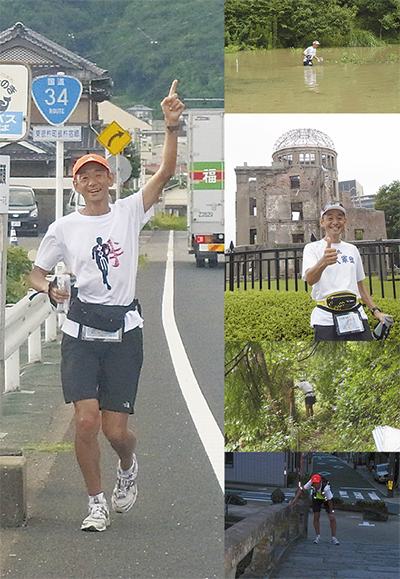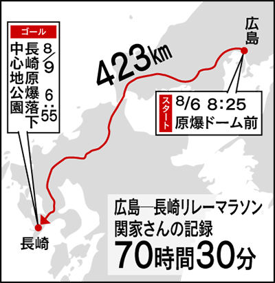 8月6日午前9時に広島県の原爆ドームをスタートし、9日午前11時までに長崎県の原爆投下中心地公園のゴールをめざす「2014広島―長崎リレーマラソン」で、南区磯部在住のウルトラマラソンランナー関家(せきや)良一(りょういち)さん(47)=星工業株式会社勤務=が初出場で制限時間内のゴールを果たした。10回目となった今年は12チーム66人が参加。1人での参加は関家さん他3人。関家さんは423・4Kmを3日間ほとんど眠らず70時間30分で走り抜いた(9日午前6時55分到着)。1人チームでの完走は大会初。大会を終えた関家さんは相模原市内で取材に応じ「途中止めたいとは思わなかった。あとになって『すごいチャレンジ』だと実感している」などと感想を話した。*関家さんのみ6日午前8時25分にスタート