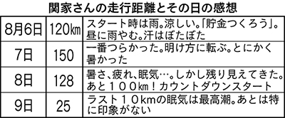 食事はこまめにとった。「(初日の夜に食べた)コンビニのざるそばが一番美味しかった。無性に牛丼が食べたくなることもあり、サポーターに周辺を探し回ってもらいました」