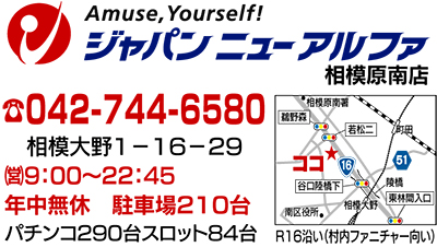 国道16号線沿い、鵜野森交差点近くのパチンコ&スロット店「ジャパンニューアルファ相模原南店」(南区相模大野)=写真上。同店は関東圏に18店舗を構えるジャパンニューアルファグループが運営するパチンコ店の1号店。今年7月には、創業満33年を迎えた。