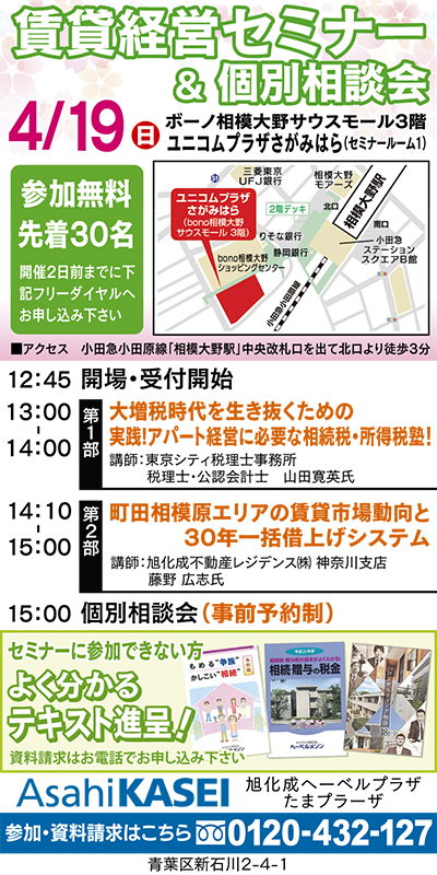 増税時代の今、資産活用の悩みや疑問に応えようと旭化成ホームズでは、4月19日(日)、午後1時からボーノ相模大野サウスモール3階「ユニコムプラザさがみはら」セミナールーム1で、無料特別講座を開催する。先着30人限定。