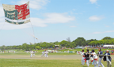 ゴールデンウィークの一大イベント「相模の大凧まつり」が5月4日、5日に相模川の新磯地区河川敷で開催された。大凧が揚がる様子を一目見ようと2日間で延べ17万人が見物に訪れた。今年の題字は「隼風(はやかぜ)」。