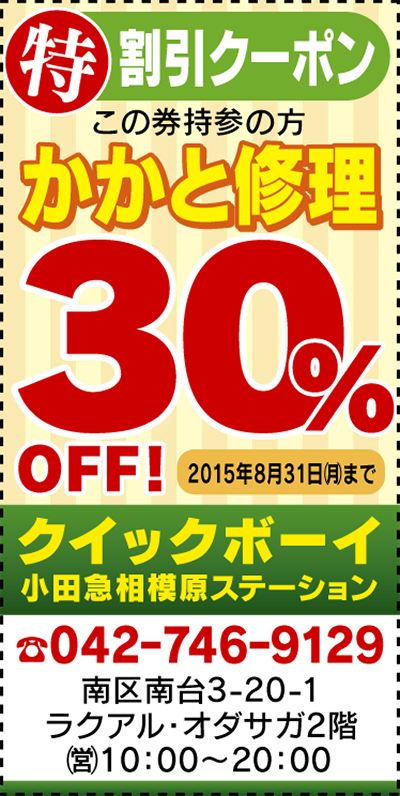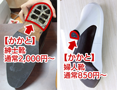 8月末まで左のクーポンでかかとの修理が30%オフに(ピンヒール通常850円〜他)。まとめて購入で割引になるピンヒールチケット(5、10足分)も好評だ。