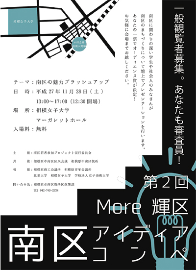 南区に関わりを持つ学生や社会人らが、区のまちづくりについて自分たちの考えを発表・提案(プレゼンテーション)する大会「第2回 More 輝区(かがやく) 南区アイディアコンペ」が11月28日(土)、相模女子大学(南区文京)のマーガレットホールで行われる。
