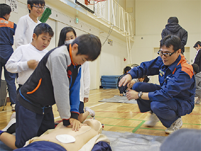 これは市消防局が主催した初の試みで、市内3区の小学校で実施された。消防局員は、「人が倒れてしまった際、救命率は時間とともに下がり、8分間でその確率はかなり低くなる。その間にできることを覚えてもらえたら」と話し、児童らは胸骨圧迫(心臓マッサージ)の方法やAED(自動体外式除細動器)の使い方などを、マネキンを使うなどして学んだ。