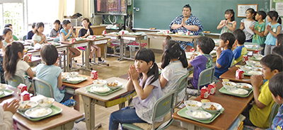 1956年6月1日に給食を開始させた同校。戦後、前身である旧大野第二国民学校の校長が「児童に給食を食べさせたい」との思いで、当時、人気のあった出羽の海一門を呼び、興行相撲を開催。収益で市内初の給食を実現した。