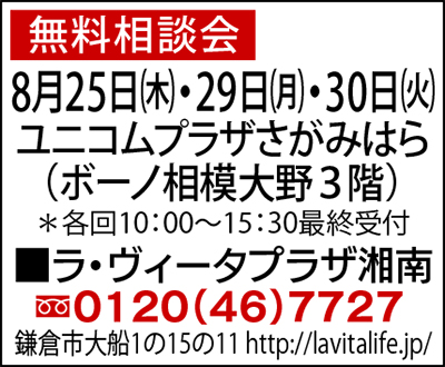 依頼者のライフスタイルや希望に合わせて老人ホーム、高齢者住宅など各種施設を第三者の立場で紹介する「ラ・ヴィータプラザ湘南」は8月25日(木)、29日(月)、30日(火)の3日間、ボーノ相模大野3階のユニコムプラザさがみはらで「無料相談会」を開催する。予約は不要で、時間は午前10時から午後3時30分最終受付。