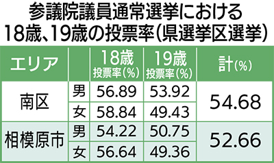 選挙権年齢が18歳に引き下げられてから、初の国政選挙となった7月の参議院議員選挙。神奈川県選挙管理委員会はこのほど、18歳と19歳の市区町村別の投票率を発表した。これによると、相模原市南区内の18歳、19歳の投票率は54・68%で、市内3区の中でトップ。54・58%だった市全体の投票率も上回った。