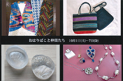 「おはりばこ」の創作ウェアーのほか、磯部和子さんのアジアの布・着物、西堀かよさんのバッグ、藤本典子さんの彫金・アクセサリー、市川倫子さんのガラスなどがズラリと並ぶ。