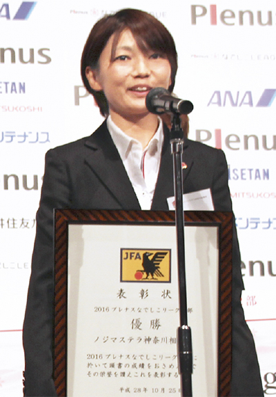 「2016プレナスなでしこリーグ/プレナスチャレンジリーグ」の表彰式が10月25日、都内のホテルで行われた。なでしこリーグ2部で優勝し、来季から1部に昇格するノジマステラ神奈川相模原からは主将の尾山沙希選手が最優秀選手賞、ミッシェル・パオ選手と南野亜里沙選手が得点王、高木ひかり選手が新人賞の栄誉に輝いた。