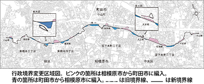 12月1日から相模原市と町田市の行政境界の一部が変更され、相模原市の総面積は9万平方メートル増えた。これは、両市の市境を流れる境川の改修工事に伴い行われる見直しで、これまでに5回実施されている。今回は6回目。緑区(東橋本)と中央区(宮下本町)の一部が対象となり、1世帯が相模原市から町田市へ住所変更を行った。