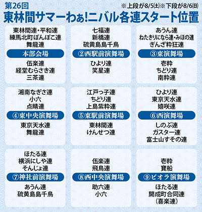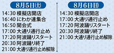 演舞は両日とも午後5時20分から駅周辺の9会場でスタートし、午後8時30分に終了。タイムスケジュールは当日、市農協前・写真の店山・エネオス東林SSの3か所で配布されるほか、祭りの公式ホームページ(http://higashirinkan-awaodori.com)でも確認できる。地元店による模擬店は、両日とも午後2時30分から開店。午後5時から9時までは大通りが通行止めとなる。