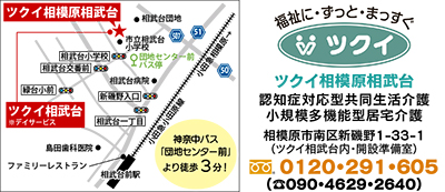 建物が完成したグループホームと小規模多機能居宅型介護の複合型介護施設『ツクイ相模原相武台』。いよいよ8月5日(土)から内覧会が始まる。内覧会の良さは、実際の部屋を見て検討できるところ。気に入った部屋はその場で予約もできる。「予約は先着順なので、人気のあるお部屋は早めの内覧がオススメです」と和田剛所長は話す。5日から7日までは、楽しいイベントもあるので(詳細は左記)、ぜひ足を運んでみて。