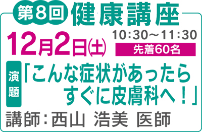 今回の講座は「こんな症状があったらすぐに皮膚科へ!」と題し、同院皮膚科医長・西山医師が講話する。