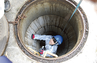 本プロジェクトに参加した生徒は28人。生徒らは下水道の仕組みやマンホール蓋の魅力等を学んだ後、11月20日には校内に設置されている汚水処理場を視察。実際に疑似汚物をトイレから流してその行く先を追い、校外へ排出されるまでの様子を見学した。マンホールに入る体験を行った小南咲穂さん(1年=写真)は、「思っているより狭かった。貴重な体験になりました」と述べていた。翌週27日には、県下水道公社の協力を仰ぎ家庭汚水のパックテストなどを実施。これらを踏まえ、生徒らはまとめ・発表作業に入っていくという。