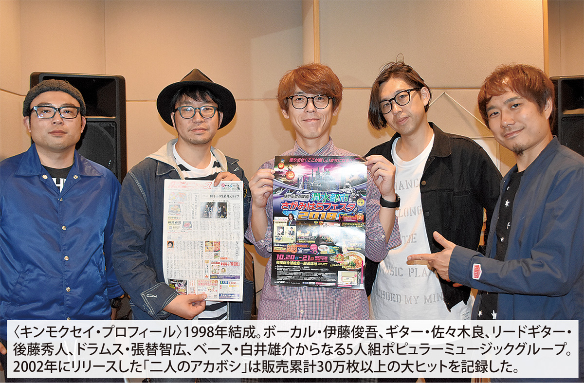 1998年に結成された地元出身の5人組バンド「キンモクセイ」。2002年にリリースした「二人のアカボシ」が大ヒットし「紅白」に出場したものの、08年に惜しまれつつ活動を休止した。そんな彼らが、10月21日の「潤水都市さがみはらフェスタ」で10年ぶりに集結し、ステージ演奏することを発表。地元出身の彼らに、改めてフェスタへの意気込みと相模原への思いを聞いた―。