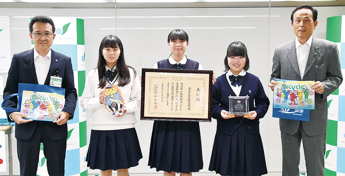 報告会には議長の三國文菜(あやな)さん(相模女子大学高等部2年)、委員の田久保陽奈(ひな)さん(同2年)、高橋香穂さん(同1年)が出席した。加山俊夫市長は「自転車事故のない街づくりに向けて、継続して活発な活動をお願いしたい」と話し、下仲宏卓副市長も「学生のうちにこうした活動に取り組むことは、大変立派だ」と、労いの言葉をかけた。