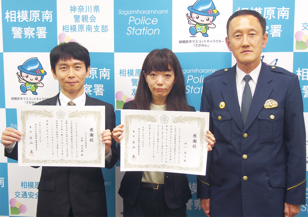 日野さんは10月26日、相模大野駅を歩いていた際、ステーションスクエアの女性店員から「ドロボー」と追呼されながら逃げている男性に遭遇。南口方面に逃げる被疑者を走って200mほど追跡し、現行犯逮捕にいたった。神戸さんも26日夕方、座間市相武台の路上で母親を探して迷っている女児を発見。放置すれば女児に危害が及ぶ恐れがあると考え、母親の居場所など話を聞き出した上でタクシーに同乗し、麻溝公園前交番に送り届けた。