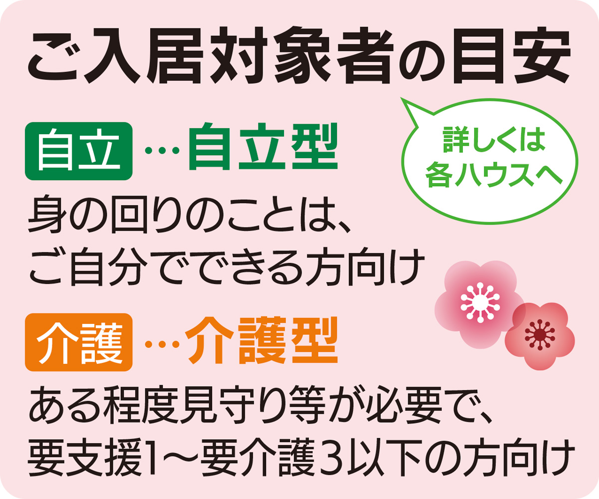 入居に関するご相談、お申し込みは、各ハウスに直接どうぞ。パンフレットや入居申込書はご郵送もできます。ケアハウスは、日常的な見守りやサポートを受けながら個室での生活が可能です。早めの住み替え等、今後の人生設計の参考にしてみてはいかがでしょうか。