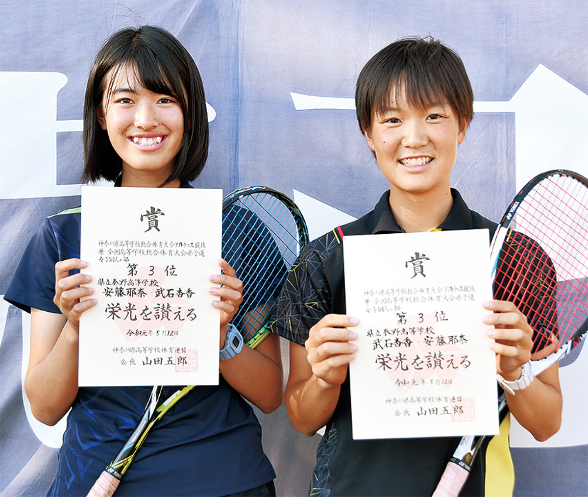 相模原市の中学校でしのぎを削ったライバル2人が同じ高校に進み、ソフトテニス競技ダブルスで全国大会に出場する。秦野高校3年の安藤那奈さん、武石杏香さんだ。