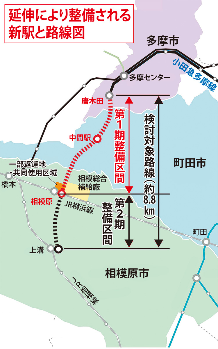 2014年には相模総合補給廠の一部返還が実現し、延伸による新駅の整備が具体化。16年4月の国土交通省の交通政策審議会では、延伸計画が両市と都心部をつなげる「意義のあるプロジェクト」の一つに位置付けられた。一方で、収支採算性に課題が残ることも指摘されたことから、同年8月に関係自治体や国交省、小田急電鉄などで関係者会議を設置し、調査研究を進めてきた。