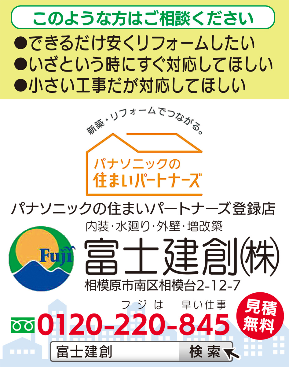 まもなく訪れる増税を前に、お得で確かなリフォームを頼むなら地元密着の専門業者「富士建創」を紹介したい。内装、水廻り、増改築などのリフォームでは価格はもとより、確かな施工技術で顧客満足度が高く好評を博している。