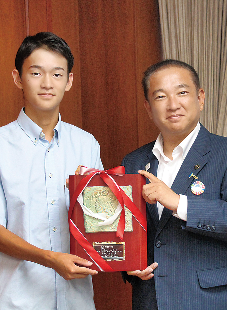 本村市長からは「称讃の楯」と奨励金が贈られた。
