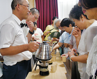 休憩時間には「出張ミヤタ珈琲」によるコーヒーの無料サービスが行われた。これは「社会福祉法人アトリエ」の障害者理解促進事業の一環で、代表の宮田貴文さんは月2、3回市内各地に出張している。助手の里村雄冶さん、照山美穂さんと協力し、一杯ずつ丁寧にコーヒーを淹れ、約110人に振舞った宮田さんは「慌ただしかったけれど、楽しい時間だった」と笑顔で話した。