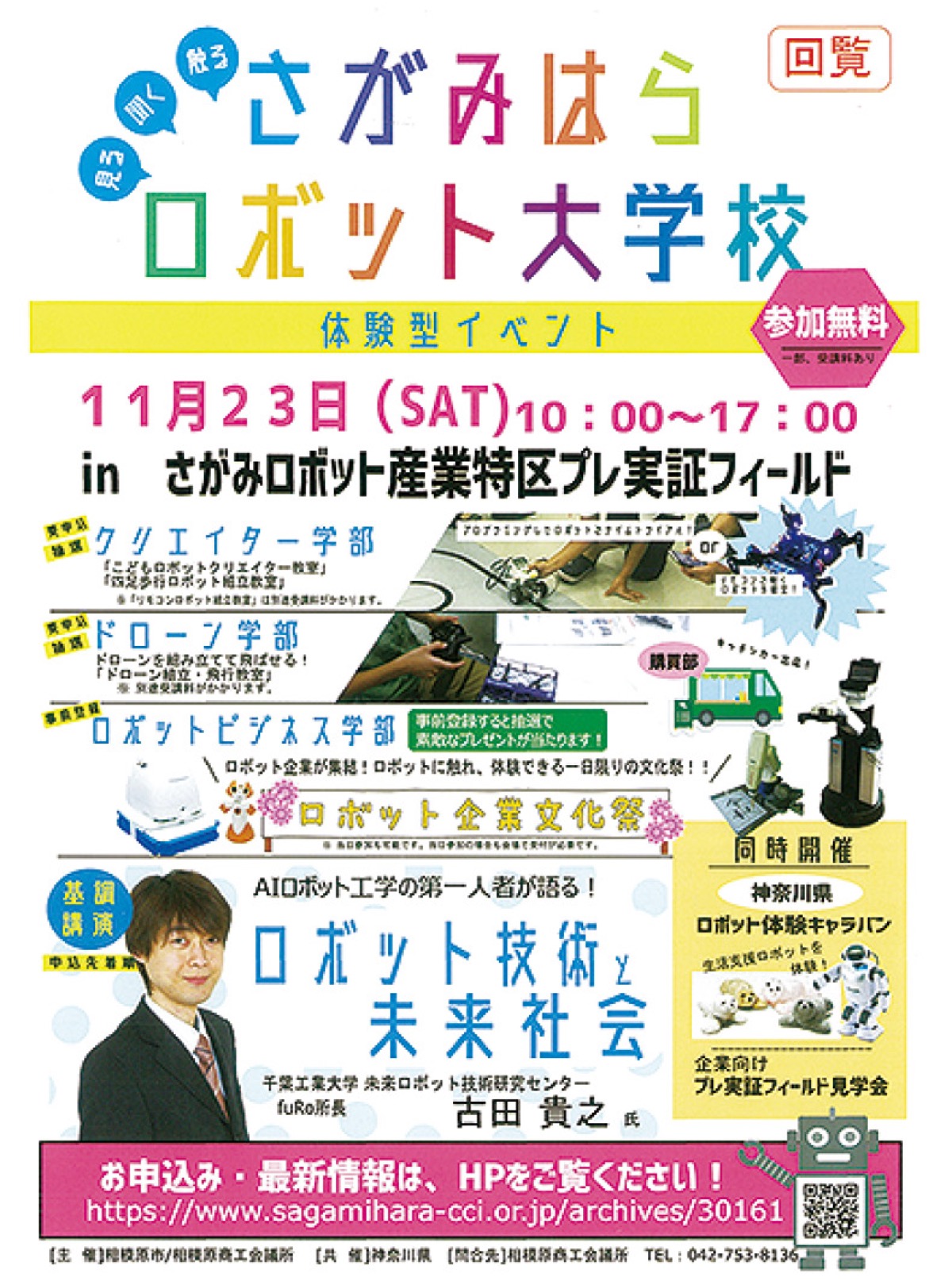 ロボットに触れ、学び、体験することのできるイベント「さがみはらロボット大学校」が11月23日(土)にさがみロボット産業特区プレ実証フィールド(新戸2607の2・元新磯高校)で開催される。主催は相模原市と相模原商工会議所。