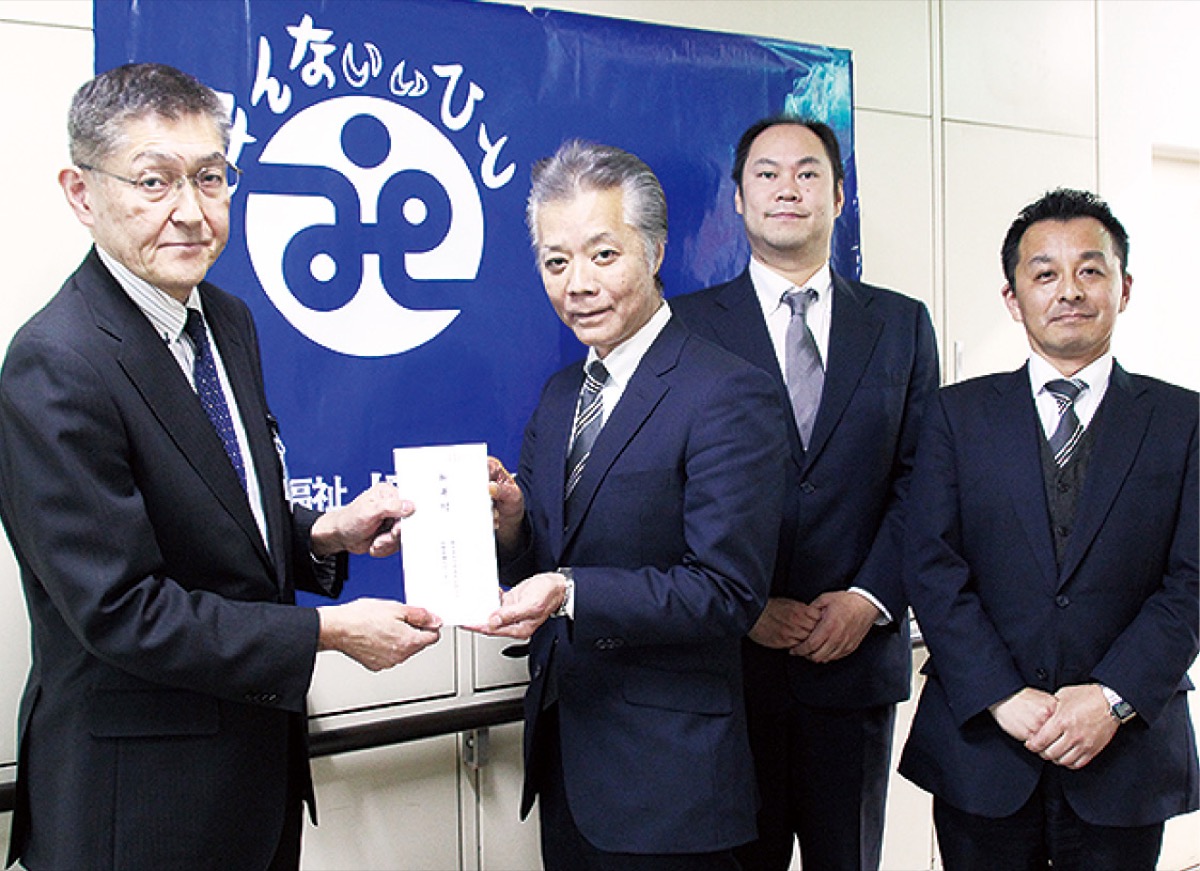 同社は5年前から同協議会への寄付を続けており、今回で5回目。笹野常務理事は「社協では今回ボランティアを中心に被災地支援に取り組んでいる。直接のボランティアだけでなく物資や支援金の提供など様々な方法で皆様にご協力頂いていることに深く感謝したい」と述べた。同社の斜木係長は「今後も様々な面で地域に密着し貢献していきたい」と話した。