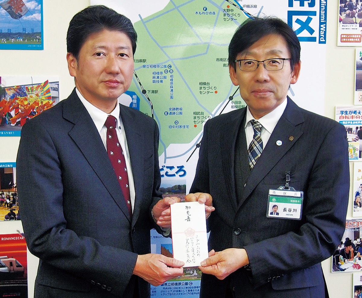 さがみおおのハロウィンフェスティバル実行委員会の高橋健吾実行委員長が5日に南区役所を訪れ、10月27日に行った同イベントで寄せられた台風19号に対する義援金3万6963円を長谷川伸区長に手渡した。高橋実行委員長は「皆さんの善意を復興に役立てていただきたい」と話した。