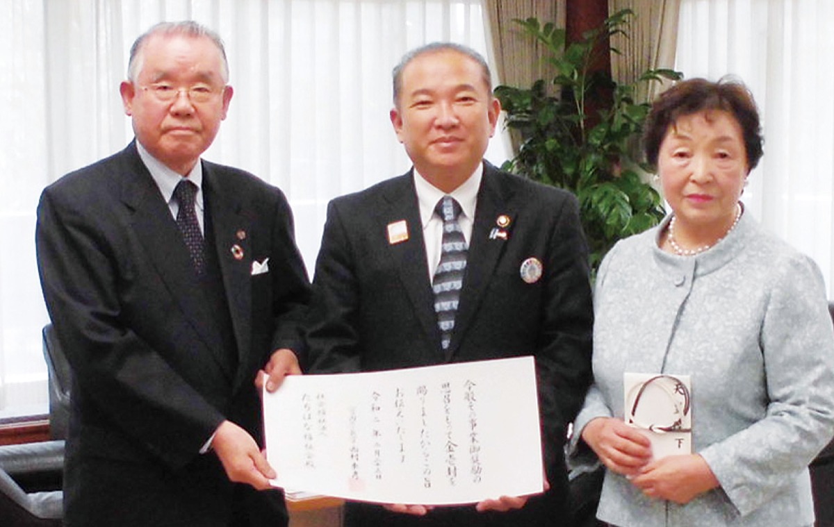 南台の「社会福祉法人たちばな福祉会(坂本堯則理事長)」は、優良民間福祉事業施設・団体として天皇陛下から金一封が下賜され、御下賜金(ごかしきん)伝達式が2月18日、市役所で行われた。