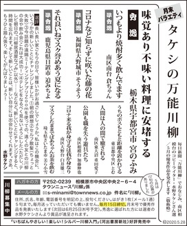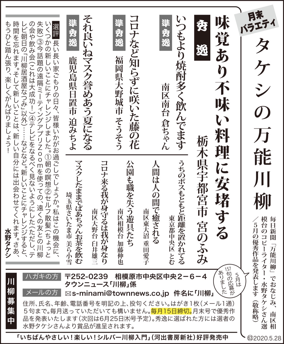 タウンニュースさがみはら南区編集室では毎月月末号に掲載される「タケシの万能川柳」の川柳を募集しています。投句いただいた作品は毎日新聞「仲畑流万能川柳」などでおなじみの水野タケシさんが選句します。応募方法は左記枠内に。