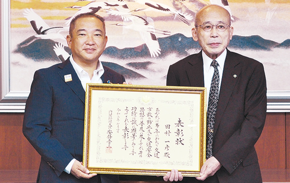 安全功労者内閣総理大臣表彰を受賞した田村一彦さん(相模大野在住)が8月21日、相模原市役所を訪れ、本村賢太郎市長に受賞報告を行った。勤務先がある秦野市の安全運転管理者会の会長を務める田村さんは、交通事故の防止や交通安全意識の浸透に尽力した個人や団体に贈られる「交通安全関係」で受賞した。