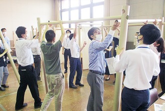 市は7月に新型コロナウイルスを考慮した避難場所と避難所の開設・運営研修を消防指令センターで実施。避難者の受け入れや、消毒・個人用防護服の着脱、待機スペース作りが行われた。8月には小中学校の体育館で実践を行った。