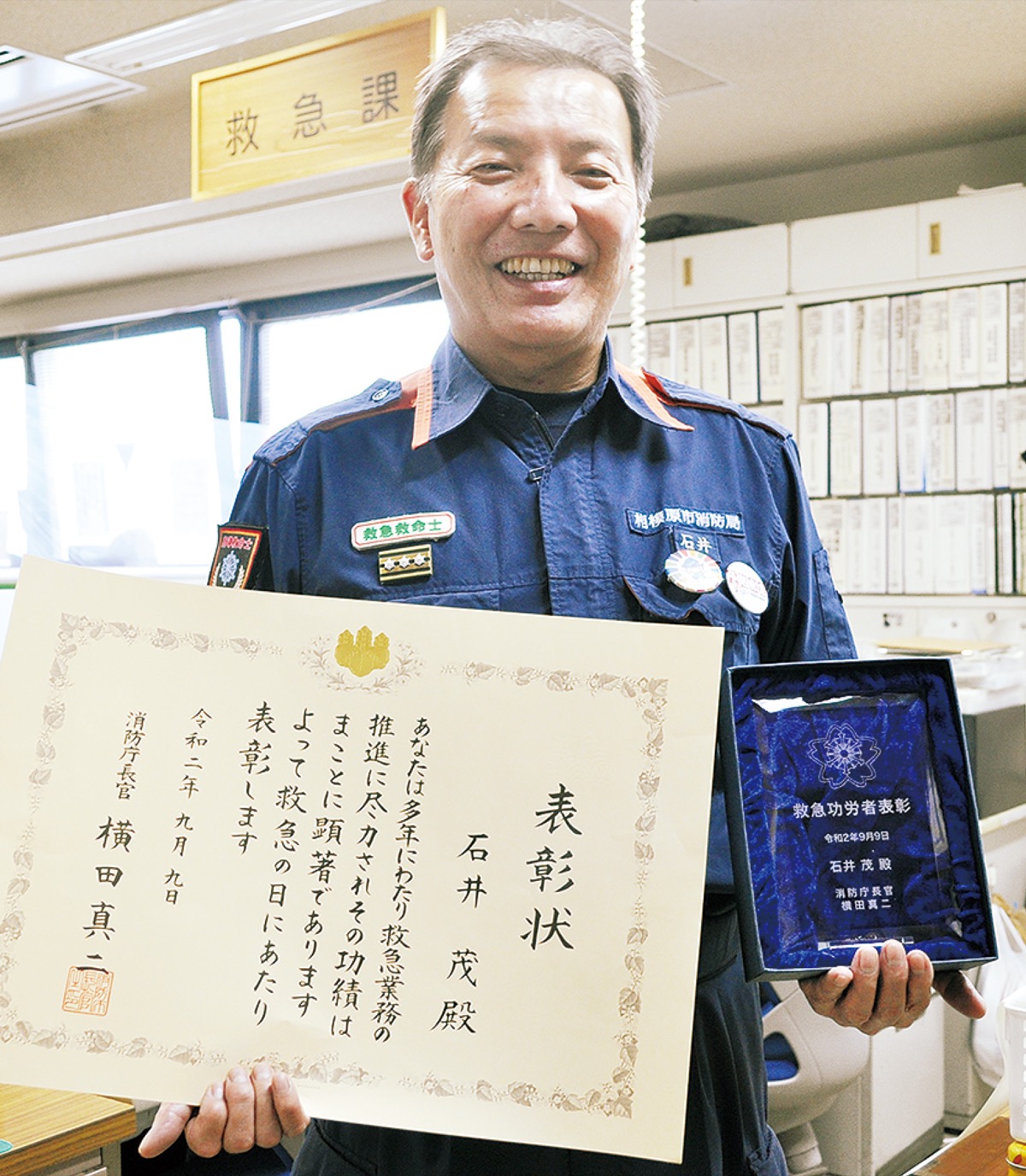 救急業務の推進に長年貢献し、社会公共の福祉の増進に顕著な功績があった個人および団体を表彰する消防庁長官表彰(救急功労者表彰)を、市消防局救急課に勤務する石井茂さん(59)=中央区東淵野辺在住=が市内で初めて個人で受賞した。