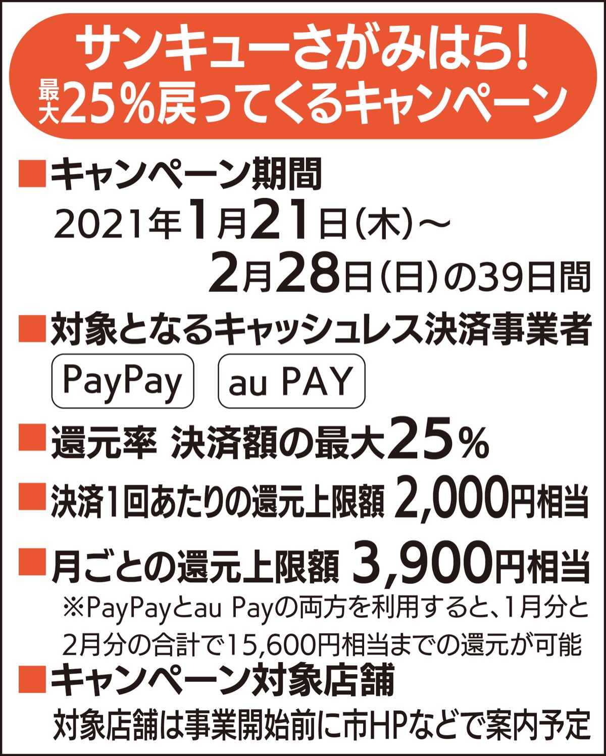 相模原市は新型コロナウイルス感染拡大で落ち込んだ経済の活性化を目的とする新たな景気刺激策として、スマートフォン決済(キャッシュレス)による還元事業を行う。期間は1月21日(木)から2月28日(日)までの39日間。利用額の最大25%が戻って来るもので、非接触型の事業のため、買い物や飲食での感染予防対策としても期待される。