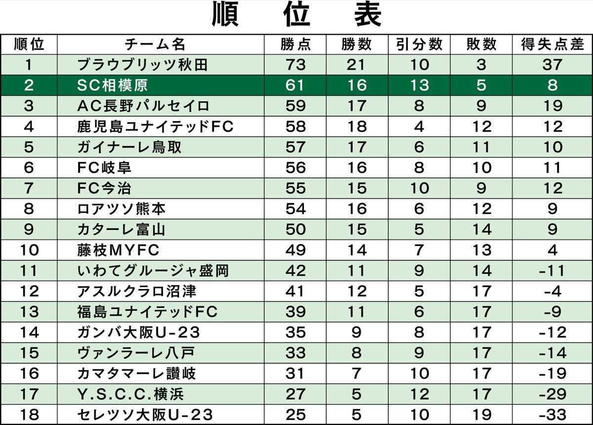 9月28日にJ2昇格に必要なライセンスを取得したSCも9月19日の引き分け以降、19戦無敗と強さを見せつけた。後半、J2昇格の2位争いは混戦となり最終節までもつれる。終盤、5試合を残して迎えたホーム戦では、ガイナーレ鳥取に勝利し2位をキープするも、次節の引き分けで3位に転落。ホーム最終戦の秋田戦もドローで2位浮上とはならなかった。