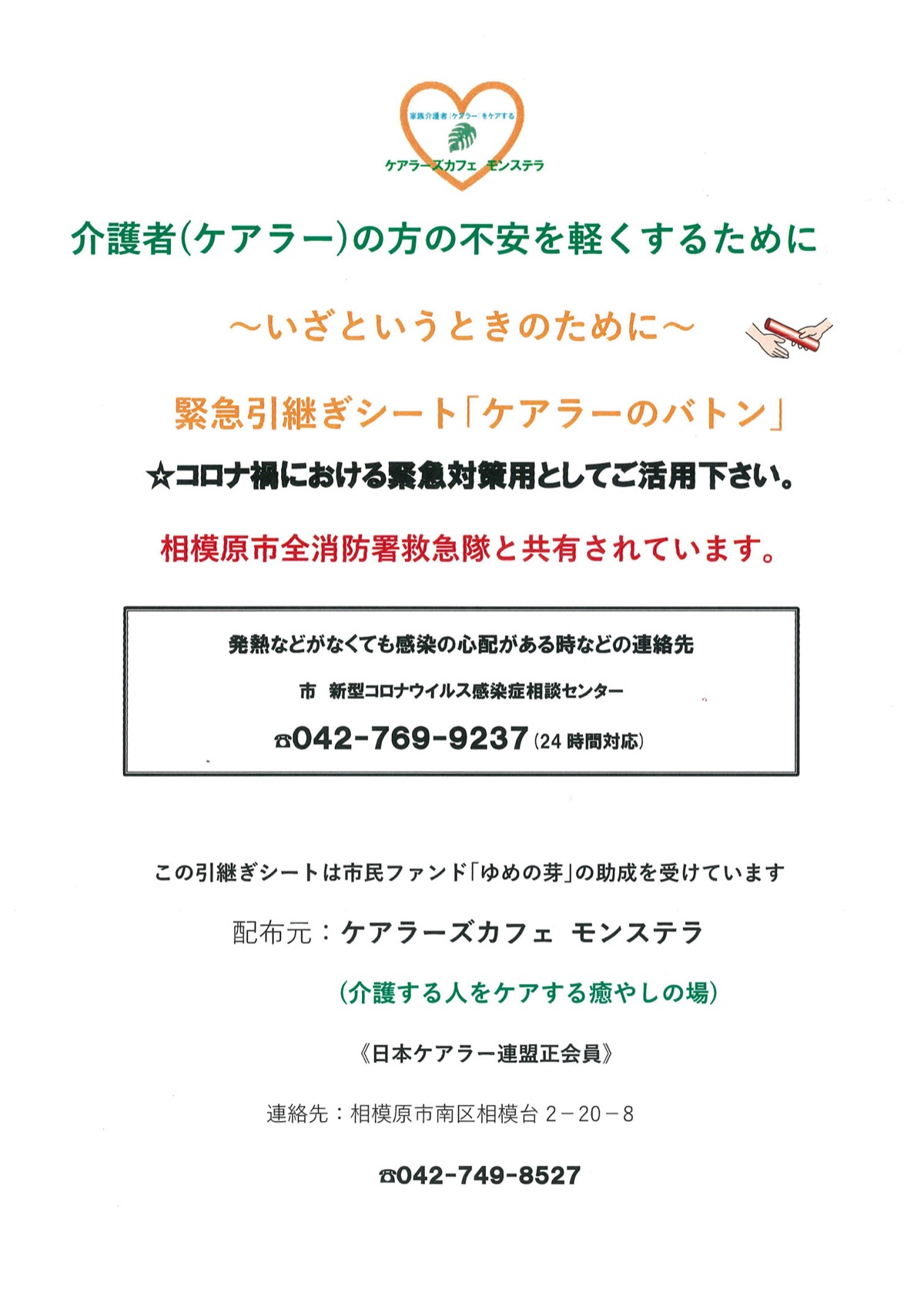 新型コロナウイルス感染症の感染拡大を受け、再度発出された緊急事態宣言。感染者の増加を危惧した「ケアラーズカフェモンステラ」の山田由美子さん・豊徳さん夫妻は、コロナ禍で緊急対策用に作成した介護者専用引継ぎシート『ケアラーのバトン』を改訂し、再び各施設に配布を始めている。