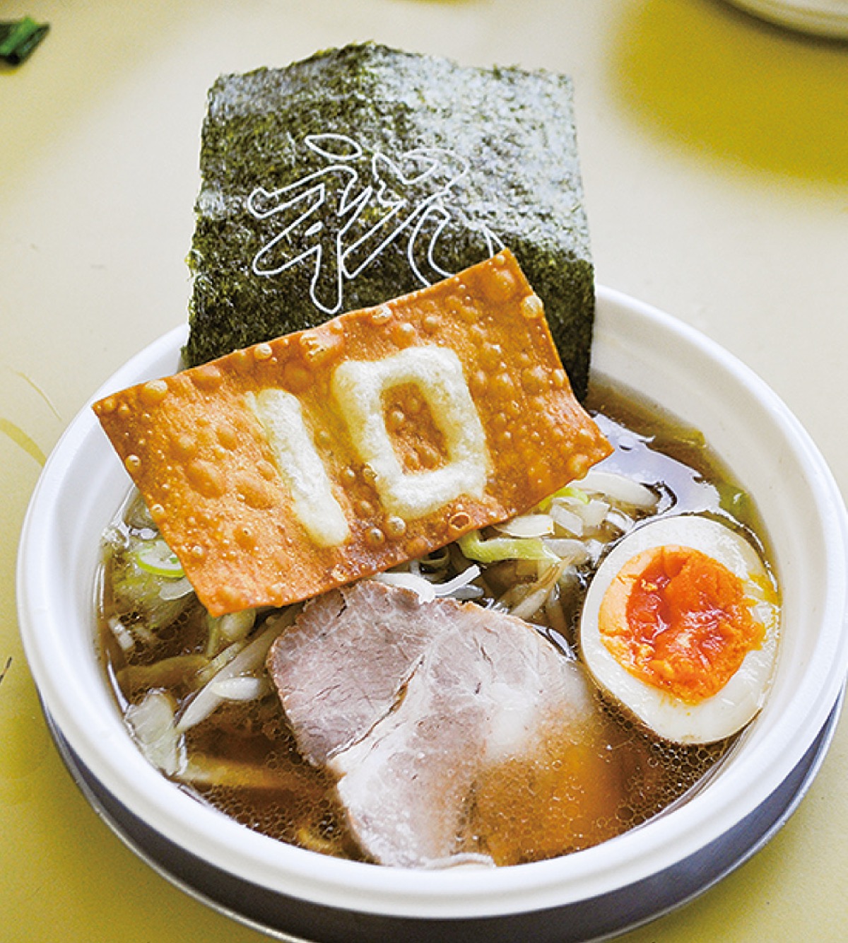 メニューの中でこだわったのが地場産の食材を使うこと。メニューに沿って素材などを選んで調理したのは、地元中華料理店「昌龍飯店」の河内文雄さん。チャーシューに相模原ブランド豚「香福豚」を使用、卵は麻溝台のたまご街道にある養鶏場の卵を使い、小松菜も地場産にこだわった。河内さんはこれらに、「祝」と書かれた海苔や「10」をあしらったワンタンを作り、よりメニューに近づけた。